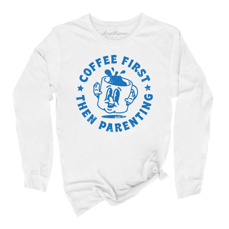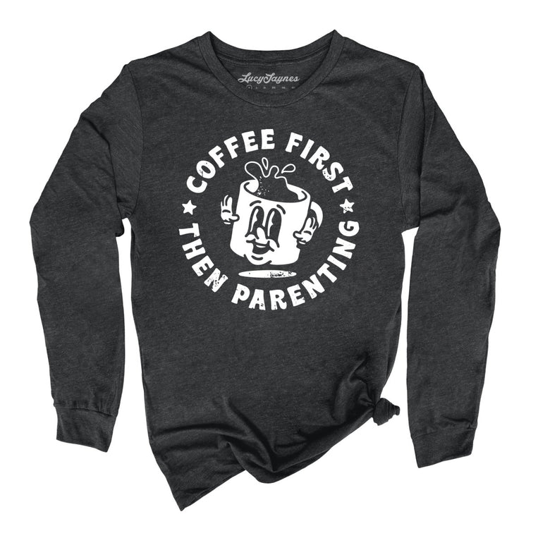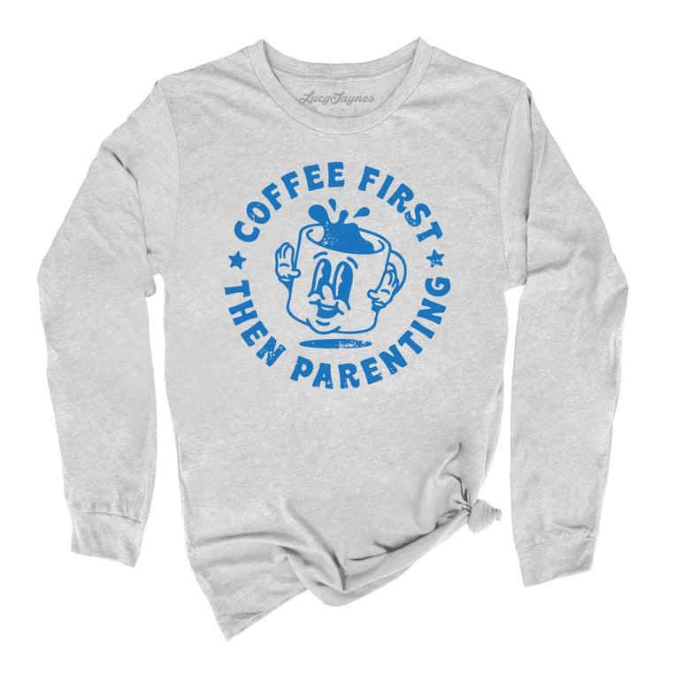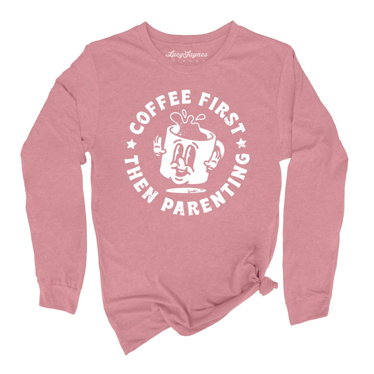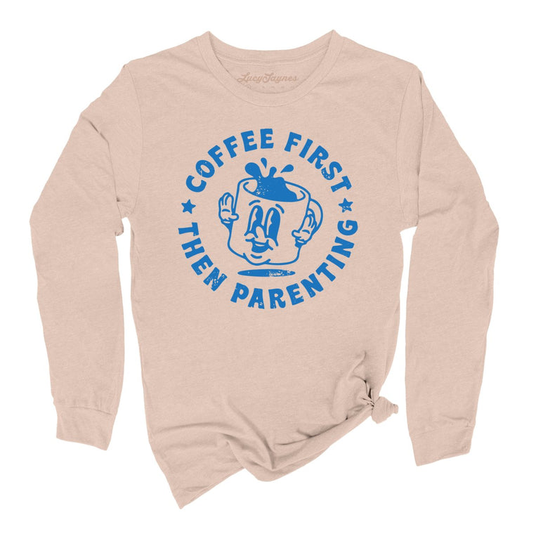 Coffee First Then Parenting Our long sleeve shirts are made with 100% Airlume ring-spun combed cotton. Heather styles are made with a 52/48 even softer blend of that same cotton & polyester.