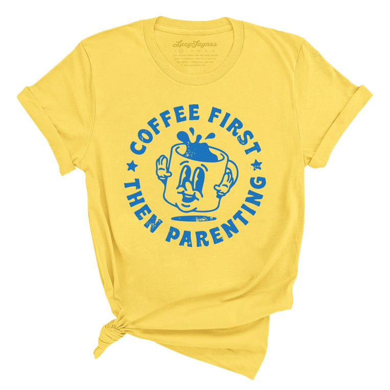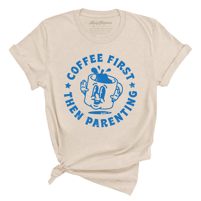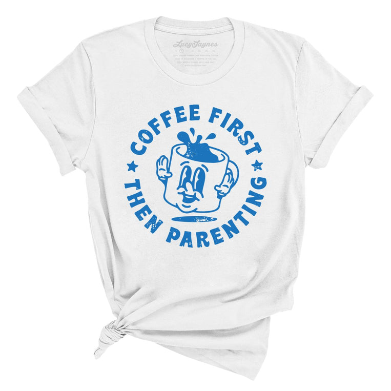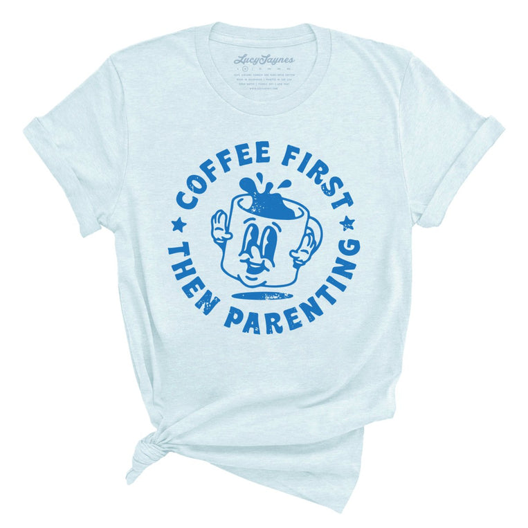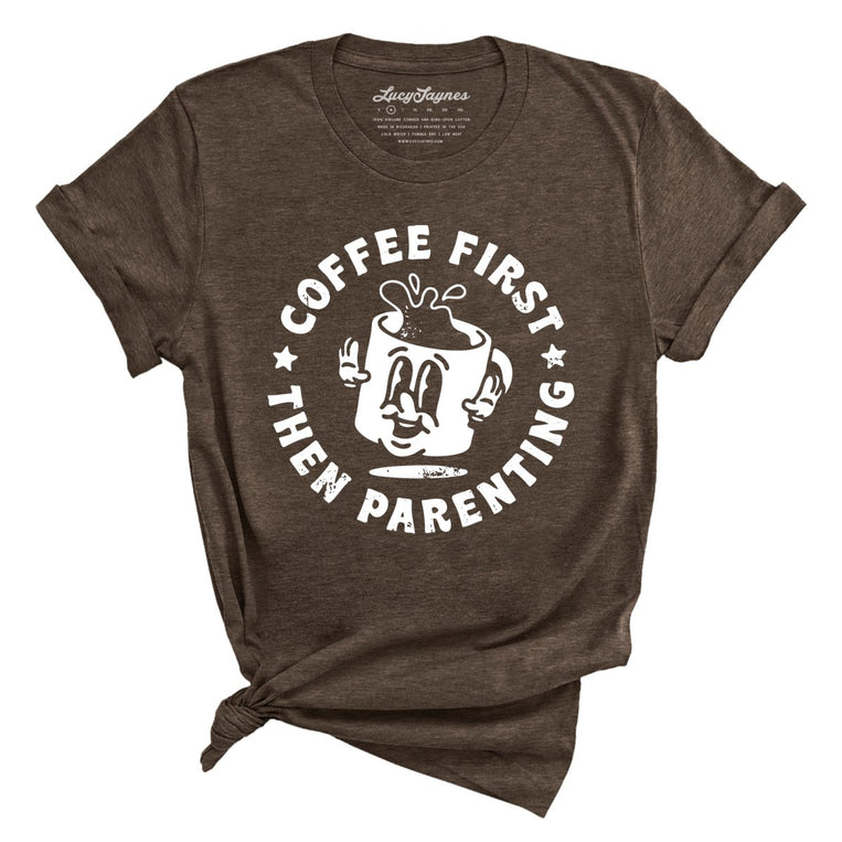Coffee First Then Parenting A stylish graphic tee designed for women. Printed on a unisex/boyfriend style cut T-Shirt made with super soft 100% Airlume ring-spun combed cotton. Heather styles are made with a 52/48 blend of that same cotton & polyester. Please use our size guide to get the fit you are looking for.
