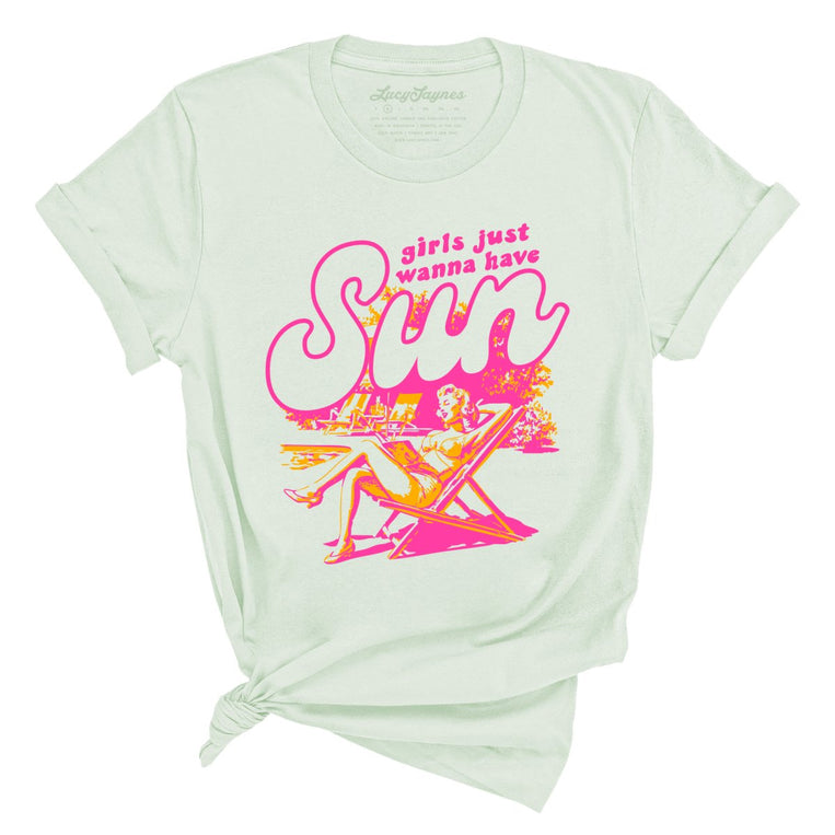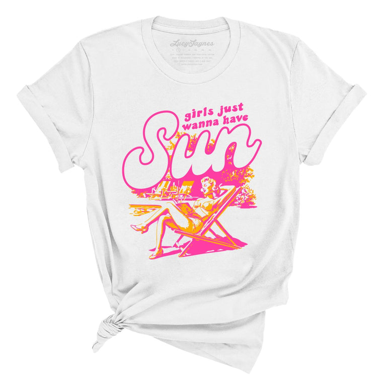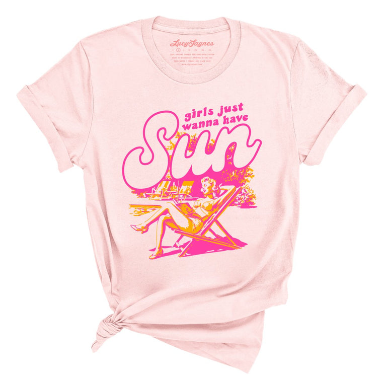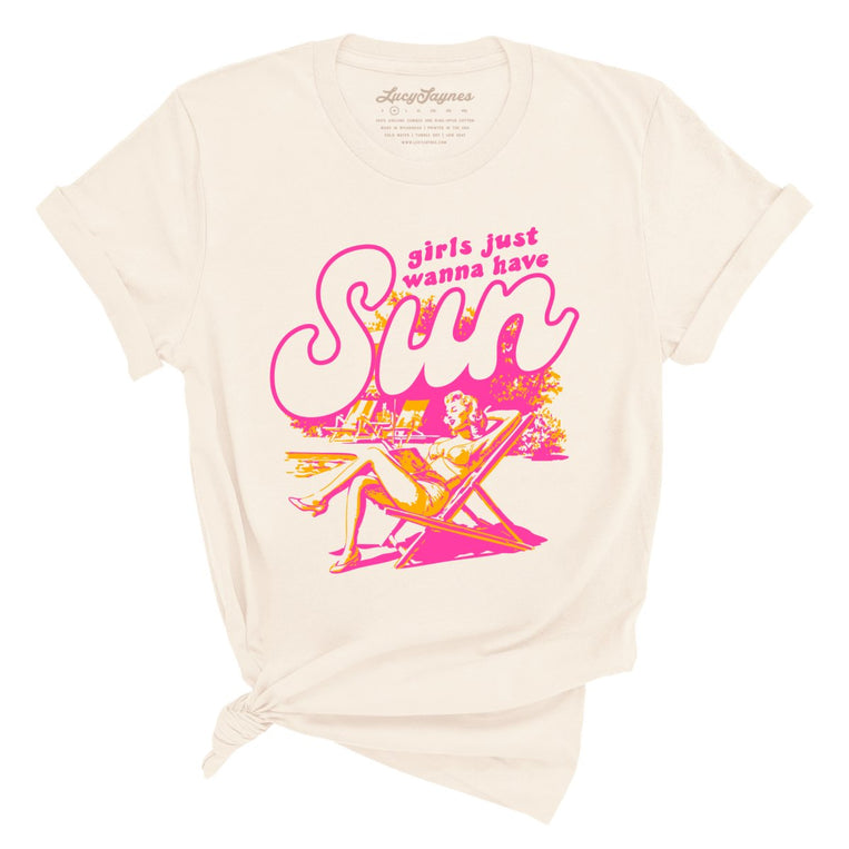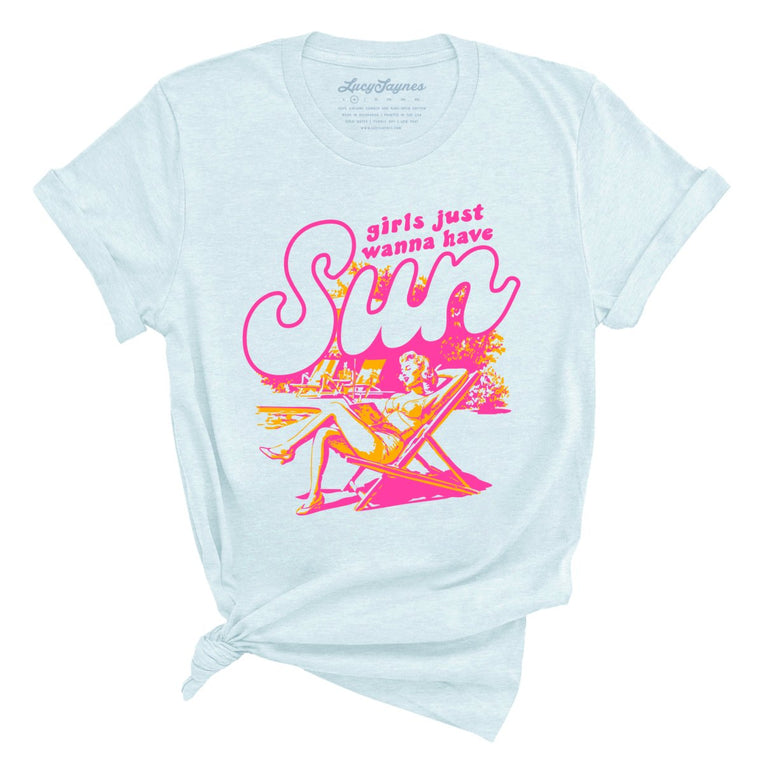 Girls Just Wanna Have Sun. A stylish graphic tee designed for women. Printed on a unisex/boyfriend style cut T-Shirt made with super soft 100% Airlume ring-spun combed cotton. Heather styles are made with a 52/48 blend of that same cotton & polyester. Please use our size guide to get the fit you are looking for.