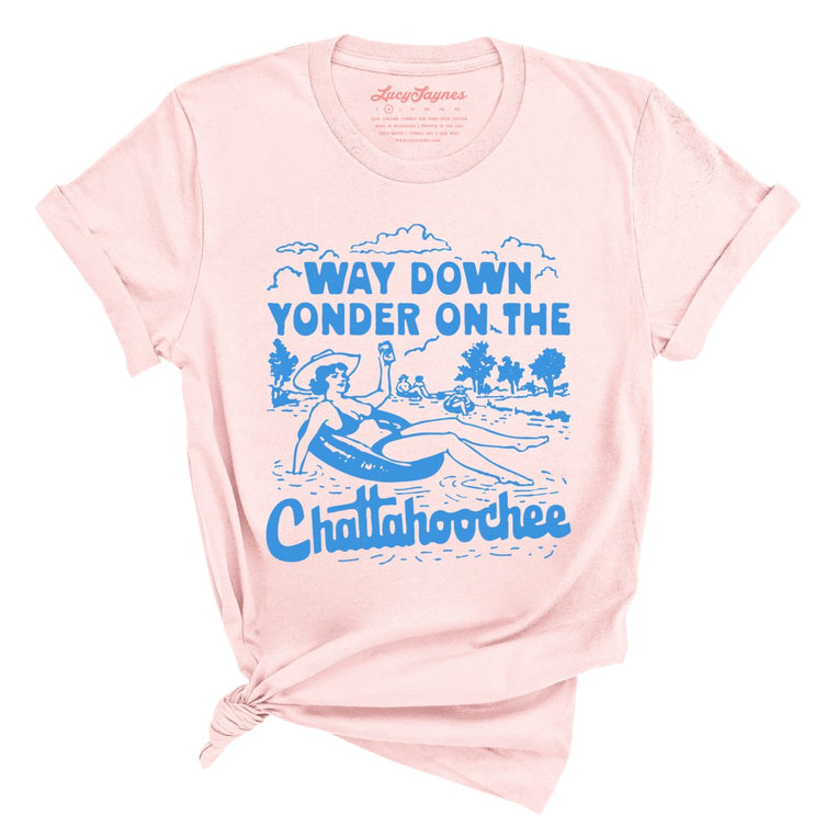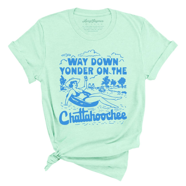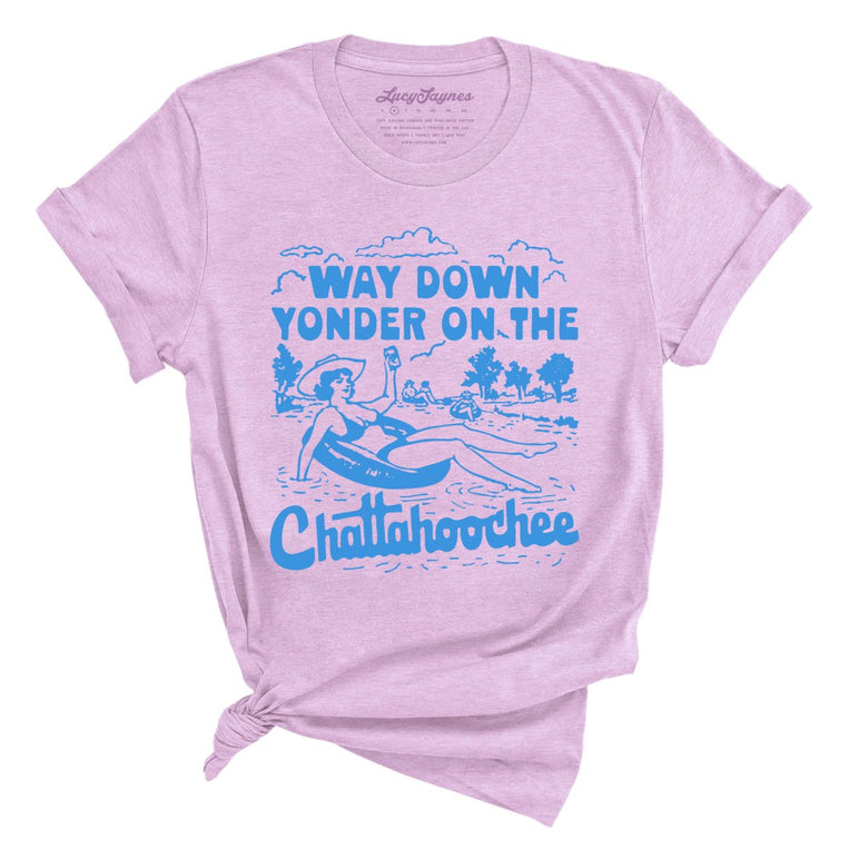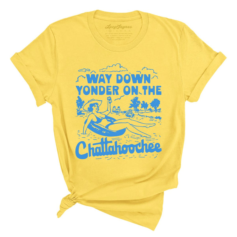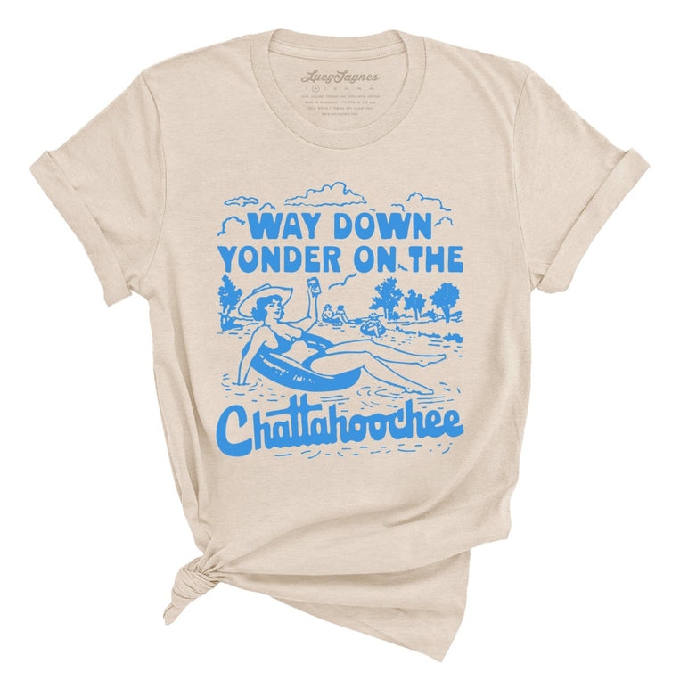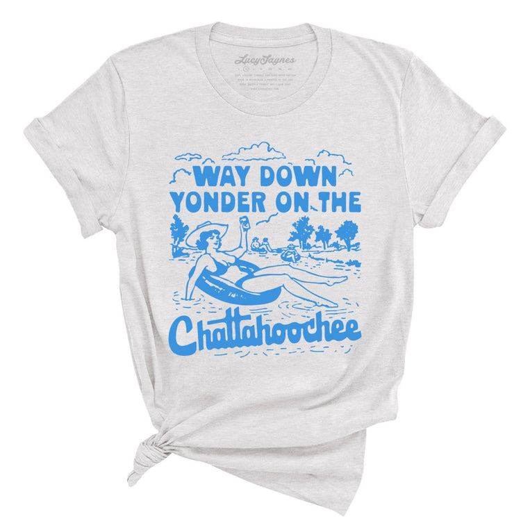 Way Down Yonder On The Chattahoochee. A stylish graphic tee designed for women. Printed on a unisex/boyfriend style cut T-Shirt made with super soft 100% Airlume ring-spun combed cotton. Heather styles are made with a 52/48 blend of that same cotton & polyester. Please use our size guide to get the fit you are looking for.